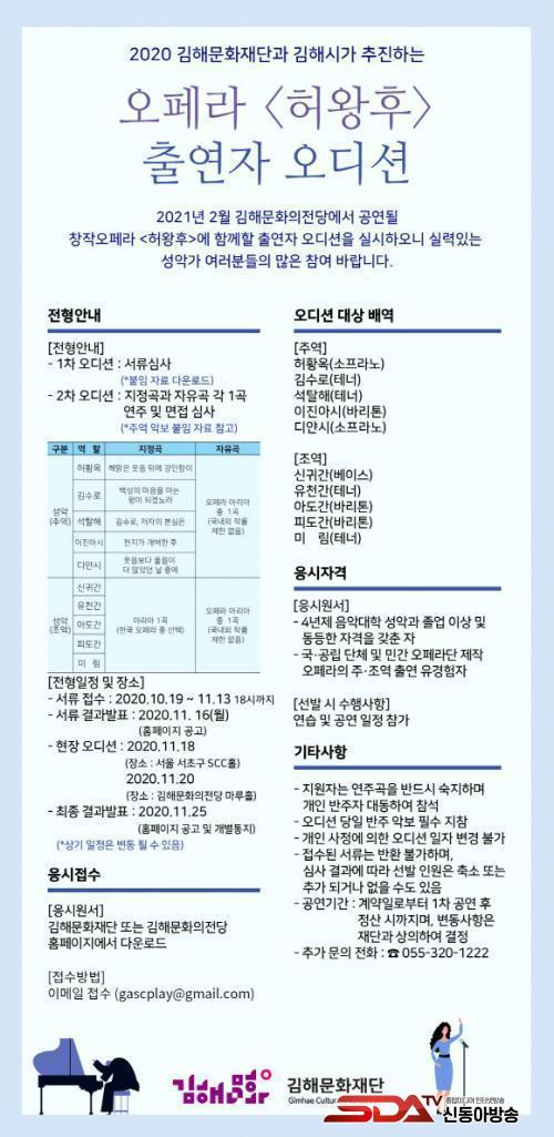 ¿Àµð¼Ç ¼·ùÁ¢¼ö´Â ¿À´Â 19ÀϺÎÅÍ 11¿ù 13ÀϱîÁöÀ̸ç, ¼·ùÇÕ°ÝÀÚ´Â 11¿ù 16ÀÏ¿¡ ȨÆäÀÌÁö¿¡ °ø°íµÇ¸ç ¿Àµð¼ÇÀº ¼¿ï°ú ±èÇØ¿¡¼ °¢°¢ ½ÃÇàµÉ ¿¹Á¤ÀÔ´Ï´Ù. ¿Àµð¼ÇÀ» ÅëÇØ ¼±¹ßµÈ Ã⿬ÀÚµéÀº 12¿ùºÎÅÍ ÆÄÆ®º° ¿¬½À°ú ÃÑ¿¬½ÀÀ» °ÅÃÄ, ³»³â 2¿ù ±èÇØ ¹®ÈÀÇÀü´ç ¸¶·çȦ ¹«´ë¿¡ ¼³ ¿¹Á¤ÀÔ´Ï´Ù.