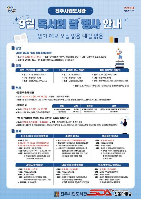 [½Åµ¿¾Æ¹æ¼Û °æ³²ÁøÁÖ=³²±Ã¿µ±â±âÀÚ] ÁøÁֽô 9¿ù µ¶¼­ÀÇ ´ÞÀ» ¸Â¾Æ ½Ã¸³µµ¼­°ü¿¡¼­ ¡®Àб⠿¹º¸: ¿À´Ã ÀÐÀ½, ³»ÀÏ ¸¼À½¡¯À̶ó´Â ½½·Î°Ç ¾Æ·¡ ´Ù¾çÇÑ µ¶¼­¹®È­ Çà»ç¸¦ ¿î¿µÇÑ´Ù°í ¹àÇû´Ù.