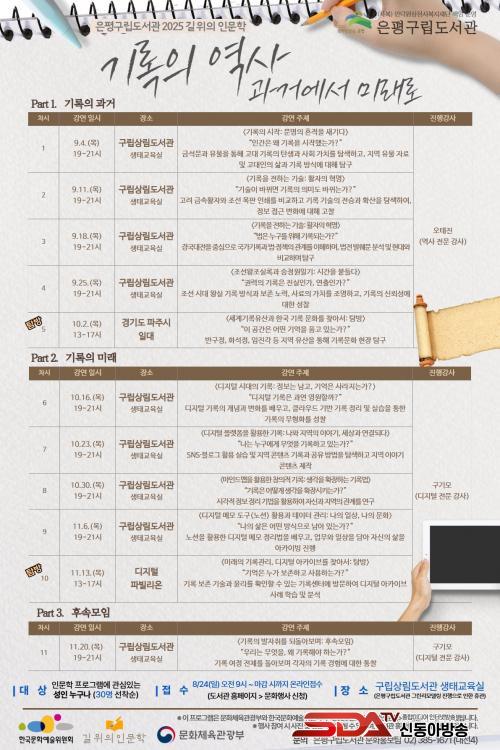 [½Åµ¿¾Æ¹æ¼Û ÀºÆò±¸=À̽ŵ¿±âÀÚ] ¼­¿ï ÀºÆò±¸´Â ÀºÆò±¸¸³µµ¼­°üÀÌ ¿À´Â 4ÀϺÎÅÍ 11¿ù 20ÀϱîÁö ¸ÅÁÖ ¸ñ¿äÀÏ, ±â·Ï¹®È­ÀÇ È帧À» µû¶ó Àΰ£°ú °øµ¿Ã¼ÀÇ »îÀ» ¼ºÂûÇÏ´Â Àι®ÇÐ ÇÁ·Î±×·¥ ¡®±â·ÏÀÇ ¿ª»ç, °ú°Å¿¡¼­ ¹Ì·¡·Î : µ¹º®¿¡ »õ±ä ¹®ÀÚ¿¡¼­ ÀΰøÁö´É±îÁö¡¯¸¦ ¿î¿µÇÑ´Ù°í ¹àÇû´Ù.