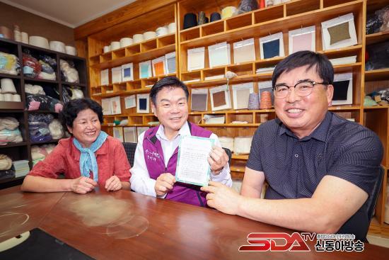ÀÌÇÊÇü µ¿´ë¹®±¸Ã»Àå°ú °­½ÅÁö ¼Û¸²¼¶À¯ ´ëÇ¥(»çÁø ¿À¸¥ÂÊ)ÀÌ ÈÄ¿ø¹ÞÀº û³âÀÇ °¨»ç ÆíÁö¸¦ Àаí ÀÖ´Ù.