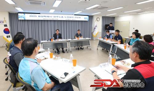 [½Åµ¿¾Æ¹æ¼Û=ÀÌÀçö±âÀÚ] È­¼ºÆ¯·Ê½Ã(½ÃÀå Á¤¸í±Ù)¿Í ¹ÎÁÖ³ëÃÑ °æ±âÁö¿ªº»ºÎ ¼ö¿ø¿ëÀοÀ»êÈ­¼ºÁöºÎ°¡ 23ÀÏ Ã¹ °ø½Ä °£´ãȸ¸¦ ¿­°í ³ëÁ¤ °£ ¼ÒÅë°ú »ó»ýÀÇ ¹°²¿¸¦ ÅÕ´Ù.