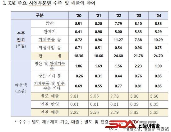 ÇÑÆí KAI´Â ¹æ»ê ¼öÃâ È®´ë¸¦ ±â¹ÝÀ¸·Î ¾ÈÁ¤ÀûÀÎ ¼ºÀå¼¼¸¦ À̾°í ÀÖ´Ù. 2024³â ÃÑ ¼öÁÖÀܰí´Â 24.7Á¶ ¿øÀ¸·Î »ç»ó ÃÖ´ëÄ¡¸¦ ±â·ÏÇßÀ¸¸ç, ¼¼ºÎÀûÀ¸·Î´Â ¹æ»ê 8.36Á¶ ¿ø, ¿ÏÁ¦±â 5.29Á¶ ¿ø, ±âüºÎǰ 10.29Á¶ ¿ø, À§¼º»ç¾÷ 0.75Á¶ ¿øÀ¸·Î ±¸¼ºµÈ´Ù. ƯÈ÷ ¿ÏÁ¦±â ºÎ¹®Àº 2020³â 0.41Á¶ ¿ø¿¡¼­ 2024³â 5.29Á¶ ¿øÀ¸·Î 12¹è ÀÌ»ó ±ÞÁõÇØ °ý¸ñÇÒ ¸¸ÇÑ ¼ºÀåÀ» º¸¿´´Ù.