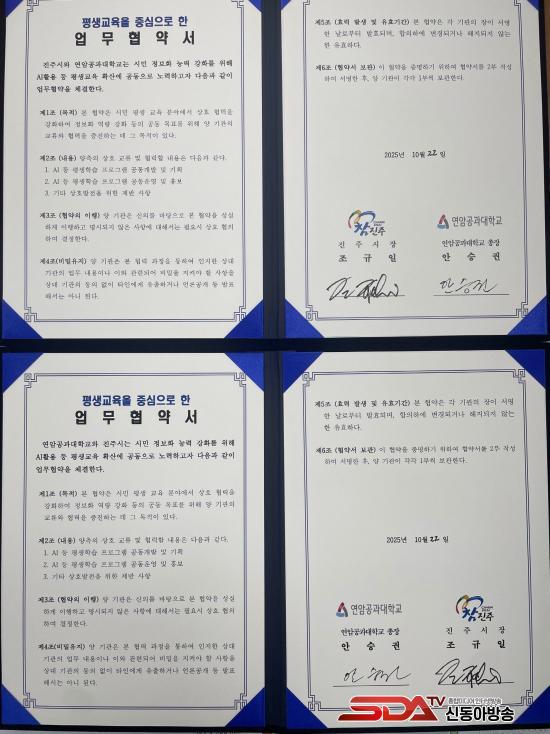 [½Åµ¿¾Æ¹æ¼Û °æ³²ÁøÁÖ=³²±Ã¿µ±â±âÀÚ] ÁøÁÖ½Ã¿Í ¿¬¾Ï°ø°ú´ëÇб³´Â Áö³­ 10¿ù 30ÀÏ, ½Ã¹ÎÀÇ Á¤º¸È­ ¿ª·® °­È­¿Í Æò»ý±³À° Ȱ¼ºÈ­¸¦ ¸ñÇ¥·Î AI ±â¹Ý Æò»ýÇнÀ ÇÁ·Î±×·¥ °³¹ß ¹× ¿î¿µ¿¡ Çù·ÂÇÏ´Â ¾÷¹«Çù¾àÀ» ü°áÇß´Ù.