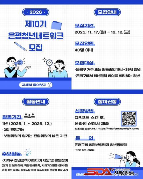 [½Åµ¿¾Æ¹æ¼Û ÀºÆò±¸=À̽ŵ¿±âÀÚ] ¼­¿ï ÀºÆò±¸´Â û³â°úÀÇ Çù·Â°ú ¼ÒÅëÀ» ÅëÇØ À̵éÀÇ ´Ù¾çÇÑ ¸ñ¼Ò¸®¸¦ Á¤Ã¥¿¡ ´ã±â À§ÇØ ¡®ÀºÆò±¸ û³â³×Æ®¿öÅ© 10±â À§¿ø¡¯À» ³»´Þ 12ÀϱîÁö ¸ðÁýÇÑ´Ù°í ¹àÇû´Ù.