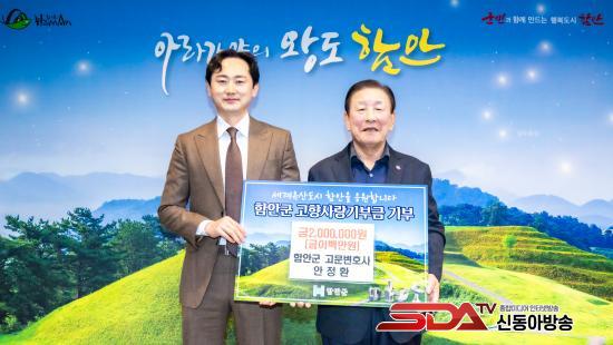 [½Åµ¿¾Æ¹æ¼Û °æ³²ÇÔ¾È=À̽ŵ¿±âÀÚ] ÇԾȱºÀº Áö³­ 1ÀÏ ¹ý¹«¹ýÀÎ ±Ý°­ ¼Ò¼Ó ¾ÈÁ¤È¯ º¯È£»ç°¡ °íÇâ»ç¶û±âºÎ±Ý 200¸¸ ¿øÀ» ±âŹÇß´Ù°í ¹àÇû´Ù. ¾ÈÁ¤È¯ º¯È£»ç´Â ¹ý¹«¹ýÀÎ ±Ý°­¿¡¼­ ¹ÎÇü»ç »ç°Ç°ú ±â¾÷ ÀÚ¹®, °ø°ø±â°ü Áö¿ø µîÀ» ¸Ã¾Æ Ȱµ¿Çϰí ÀÖÀ¸¸ç Áö¿ª°úÀÇ ¿¬´ë¸¦ Áß¿äÇÏ°Ô »ý°¢ÇØ ¿Â ¹ýÁ¶ÀÎÀ¸·Î ¾Ë·ÁÁ® ÀÖ´Ù. À̹ø ±âºÎ´Â °íÇâ ¹ßÀü¿¡ ±â¿©ÇϰíÀÚ ÇÏ´Â ¸¶À½¿¡¼­ ÀÌ·ïÁ³´Ù.