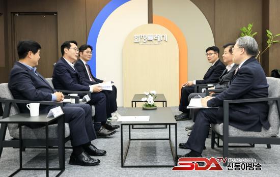 »çÁø=Á¤¸í±Ù È­¼ºÆ¯·Ê½ÃÀå°ú °­¼®Áø Áß¼Òº¥Ã³±â¾÷ÁøÈï°ø´Ü ÀÌ»çÀåÀ» ºñ·ÔÇÑ °ü°èÀÚµéÀÌ 18ÀÏ Çù¾à°ú °ü·ÃÇØ ´ëÈ­¸¦ ³ª´©°í ÀÖ´Ù