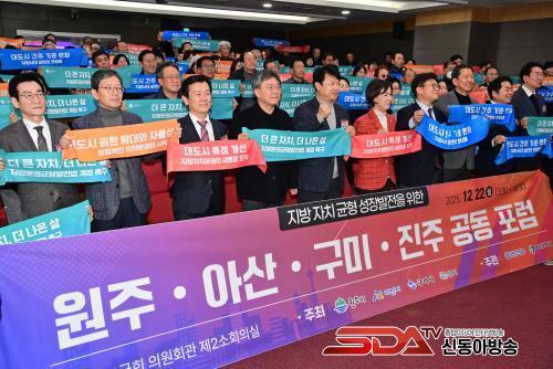 ƯÈ÷ À̳¯ Æ÷·³¿¡¼­´Â ÁøÁÖ¡¤¿øÁÖ¡¤¾Æ»ê¡¤±¸¹Ì½Ã µî 4°³ã¼ ½ÃÀåÀÌ °øµ¿¼±¾ð¹®¿¡ ¼­¸íÇϰí, Àα¸ 30¸¸ ¸í¡¤¸éÀû 500§´ ÀÌ»óÀÇ Áö¹æÀÚÄ¡´Üü¿¡ ´ëµµ½Ã Ư·Ê¸¦ ºÎ¿©ÇÒ ¼ö ÀÖµµ·Ï ¡ã¡¸Áö¹æÀÚÄ¡ºÐ±Ç ¹× Áö¿ª±ÕÇü¹ßÀü¿¡ °üÇÑ Æ¯º°¹ý¡¹ ÀϺΰ³Á¤¾ÈÀÇ Á¶¼ÓÇÑ Åë°ú ¡ãÁö¹æ °ÅÁ¡µµ½ÃÀÇ ÀÚÀ²Àû ¼ºÀå ¿©°ÇÀ» µÞ¹ÞħÇÒ Á¦µµÀû ±â¹Ý ¸¶·Ã ¡ã½ÇÁúÀûÀÎ ±ÇÇÑ À̾ç°ú ¹Ì·¡ ¼ºÀå µ¿·Â Áö¿øÀ» Á¤ºÎ¿Í ±¹È¸¿¡ °øµ¿À¸·Î °ÇÀÇÇß´Ù.
