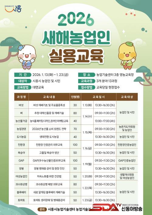 [½Åµ¿¾Æ¹æ¼Û ½ÃÈï½Ã=À̽ŵ¿±âÀÚ] ½ÃÈï½Ã´Â ³ó¾÷ÀÎÀÇ Àü¹®¿ª·® °­È­¿Í ¾ÈÁ¤ÀûÀÎ ¿µ³ó Ȱµ¿À» Áö¿øÇϱâ À§ÇØ ¡®2026³â »õÇØ³ó¾÷ÀÎ ½Ç¿ë±³À°¡¯À» ¿À´Â 1¿ù 13ÀϺÎÅÍ 23ÀϱîÁö ½ÃÈï½Ã³ó¾÷±â¼ú¼¾ÅÍ 3Ãþ ¿µ³ó±³À°Àå¿¡¼­ ¿î¿µÇÑ´Ù.