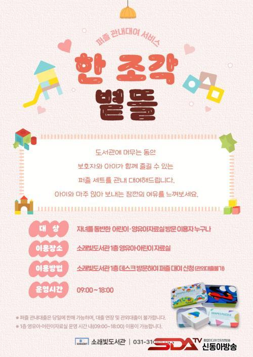 [½Åµ¿¾Æ¹æ¼Û ½ÃÈï½Ã=À̽ŵ¿±âÀÚ] ½ÃÈï½Ã ¼Ò·¡ºûµµ¼­°üÀº ¾î¸°À̸¦ À§ÇÑ °ü³» ÆÛÁñ ´ë¿© ¼­ºñ½º ¡®ÇÑ Á¶°¢ ºµ¶ã¡¯À» »õ·Ó°Ô ¼±º¸ÀδÙ. ÀÌ ¼­ºñ½º´Â ºü¸¥ ¿µ»ó°ú Áï°¢ÀûÀÎ Àڱؿ¡ Àͼ÷ÇØÁø ¾ÆÀ̵éÀÌ Àá½Ã ¼Óµµ¸¦ ´ÊÃß°í, ¼Õ³¡ °¨°¢°ú ÁýÁß·ÂÀ» ÀÚ¿¬½º·´°Ô ±â¸¦ ¼ö ÀÖµµ·Ï ¸¶·ÃµÆ´Ù.
