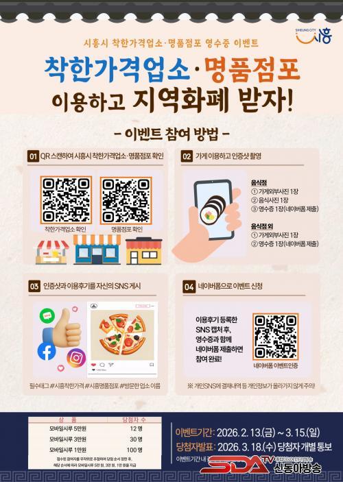 À̹ø À̺¥Æ®´Â ±â°£ ³» ½Ã¹ÎÀÌ ÂøÇѰ¡°Ý¾÷¼Ò ¶Ç´Â ¸íǰÁ¡Æ÷¸¦ ÀÌ¿ëÇÑ µÚ °³ÀÎ »çȸ°ü°è¸Á¼ºñ½º(SNS)¿¡ ÀÌ¿ë Èı⸦ °Ô½ÃÇϰí, ½ÃÈï½Ã ´©¸®Áý »õ¼Ò½Ä°ú ½Ã·ç ¾Û(App)¿¡ °Ô½ÃµÈ È«º¸¹°ÀÇ Á¤º¸¹«´Ì(Å¥¾ËÄÚµå)¸¦ ÅëÇØ ³×À̹ö Æû¿¡ Á¢¼ÓÇØ ¹æ¹® Èıâ¿Í ¿µ¼öÁõÀ» Á¦ÃâÇÏ´Â ¹æ½ÄÀ¸·Î ÁøÇàµÈ´Ù. ½Ã´Â Âü¿©ÀÚ °¡¿îµ¥ ¹«ÀÛÀ§ Ãß÷À» ÅëÇØ ÃÑ 142¸í¿¡°Ô Áö¿ªÈÆó ¸ð¹ÙÀÏ ½Ã·ç¸¦ Áö±ÞÇÒ ¿¹Á¤À̸ç, ´ç÷ÀÚ´Â ¿À´Â 3¿ù 18ÀÏ °³º° Å뺸ÇÑ´Ù.