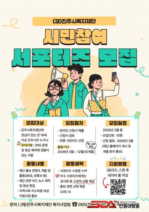 [½Åµ¿¾Æ¹æ¼Û °æ³²ÁøÁÖ=³²±Ã¿µ±â±âÀÚ] ÁøÁֽú¹ÁöÀç´ÜÀº ½Ã¹Î°úÀÇ ¼ÒÅë°ú °ø°¨À» È®´ëÇϰí Áö¿ª»çȸ º¹Áö³×Æ®¿öÅ©¸¦ °­È­Çϱâ À§ÇØ 2026³â¡®Á¦1±â ½Ã¹ÎÂü¿©(SNS) ¼­Æ÷ÅÍÁ¸¦ ¸ðÁýÇÑ´Ù°í 4ÀÏ ¹àÇû´Ù.