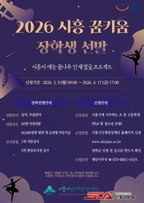 [½Åµ¿¾Æ¹æ¼Û ½ÃÈï½Ã=À̽ŵ¿±âÀÚ] ½ÃÈï½ÃÀÎÀç¾ç¼ºÀç´ÜÀº Áö¿ª ³» ¿¹´É ºÐ¾ß ÀÎÀ縦 ¹ß±¼¤ýÀ°¼ºÇϱâ À§ÇØ ¡®2026³â ½ÃÈï ²ÞŰ¿ò ÀåÇлý¡¯À» 60¸í À̳»·Î ¼±¹ßÇÑ´Ù.