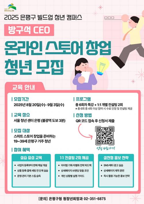 [½Åµ¿¾Æ¹æ¼Û ÀºÆò±¸=À̽ŵ¿±âÀÚ] ¼­¿ï ÀºÆò±¸´Â ¿Â¶óÀÎ ½º¸¶Æ®½ºÅä¾î â¾÷À» ÁغñÇϰí Àִ û³âÀ» À§ÇÑ ¡®¹æ±¸¼® CEO¡¯ ÇÁ·Î±×·¥ Âü¿©ÀÚ¸¦ ³»´Þ 3ÀϱîÁö ¸ðÁýÇÑ´Ù°í ¹àÇû´Ù. À̹ø ÇÁ·Î±×·¥Àº ¡®ºôµå¾÷ û³â Ä·ÆÛ½º¡¯ÀÇ ¼¼ ¹øÂ° °úÁ¤À¸·Î ±âȹµÆ´Ù. ¡®ºôµå¾÷ û³â Ä·¡¦