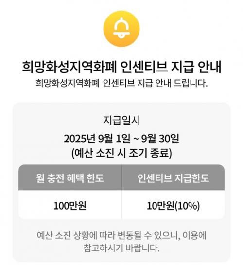 [½Åµ¿¾Æ¹æ¼Û=ÀÌÀçö±âÀÚ] È­¼ºÆ¯·Ê½Ã(½ÃÀå Á¤¸í±Ù)°¡ 9¿ù°ú 10¿ù µÎ ´Þ°£ ¡®Èñ¸ÁÈ­¼ºÁö¿ªÈ­Æó¡¯ÀÇ Àμ¾Æ¼ºê°¡ Áö±ÞµÇ´Â °³Àκ° ±¸¸Å Çѵµ¸¦ ¿ù ÃÖ´ë 50¸¸ ¿ø¿¡¼­ 100¸¸ ¿ø±îÁö·Î µÎ ¹è »óÇâÇÑ´Ù°í 2ÀÏ ¹àÇû´Ù. Àμ¾Æ¼ºê´Â ±¸¸Å ±Ý¾×ÀÇ 10%¸¦ À¯ÁöÇϸç, 100¸¸ ¿øÀ» Ãæ¡¦
