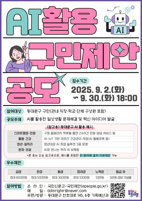 [½Åµ¿¾Æ¹æ¼Û µ¿´ë¹®±¸=À̽ŵ¿±âÀÚ] ¼­¿ï µ¿´ë¹®±¸´Â ±¸¹ÎµéÀÇ Ã¢ÀÇÀûÀÎ ¾ÆÀ̵ð¾î¸¦ ±¸Á¤¿¡ ¹Ý¿µÇϱâ À§ÇØ 9¿ù 2ÀϺÎÅÍ 30ÀϱîÁö ¡¸AI ±¸¹ÎÁ¦¾È ÁýÁß°ø¸ð¡¹¸¦ ÁøÇàÇÑ´Ù°í ¹àÇû´Ù. À̹ø °ø¸ð´Â ¡®AI¸¦ Ȱ¿ëÇÑ ÀÏ»ó»ýȰ ¼Ó ¹®Á¦ÇØ°á ¹× Çõ½Å ¾ÆÀ̵ð¾î ¹ß±¼¡¯À̶ó´Â ÁÖÁ¦¡¦