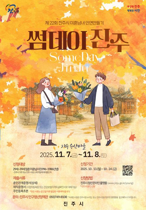[½Åµ¿¾Æ¹æ¼Û °æ³²ÁøÁÖ=³²±Ã¿µ±â±âÀÚ] ÁøÁֽô 13ÀϺÎÅÍ 24ÀϱîÁö ûÃá³²³àÀÇ ¸¸³²À» ÅëÇÑ ¼Ö·ÎÅ»ÃâÀÇ ±âȸ¸¦ Á¦°øÇÏ´Â ¡®½æµ¥ÀÌ ÁøÁÖ¡¯ Çà»çÀÇ Âü°¡ÀÚ¸¦ ¸ðÁýÇÑ´Ù. À̹ø Çà»ç´Â ¿À´Â 11¿ù 7Àϰú 8ÀÏ, 1¹Ú 2ÀÏ·Î Áö¼ö ½Â»ê¸¶À» ÀÏ¿ø¿¡¼­ ¿­¸®¸ç, ºÎÀÚ¸¶À» µ¥ÀÌÆ®, ±×¡¦