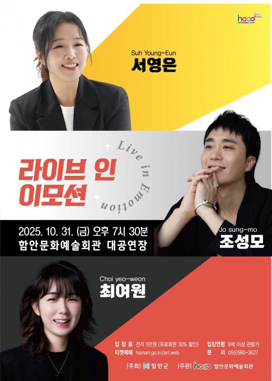 [½Åµ¿¾Æ¹æ¼Û °æ³²ÇÔ¾È=À̽ŵ¿±âÀÚ] ÇԾȱºÀº Á¶¼º¸ð¡¤¼­¿µÀº¡¤ÃÖ¿©¿øÀÌ ÇÔ²²ÇÏ´Â ¡®¶óÀ̺ê ÀÎ À̸ð¼Ç(Live in Emotion)¡¯ Äܼ­Æ®°¡ ¿À´Â 10¿ù 31ÀÏ ¿ÀÈÄ 7½Ã 30ºÐ ÇÔ¾È ¹®È­¿¹¼úȸ°ü ´ë°ø¿¬Àå¿¡¼­ °³ÃÖµÈ´Ù°í ¹àÇû´Ù. À̹ø °ø¿¬Àº ÇԾȹ®È­¿¹¼úȸ°ü °³°ü 20ÁÖ³âÀ» ±â¡¦