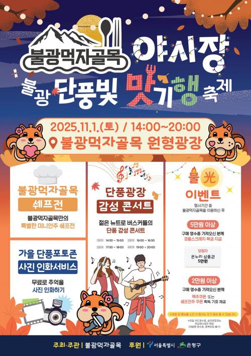 [½Åµ¿¾Æ¹æ¼Û ÀºÆò±¸=À̽ŵ¿±âÀÚ] ¼­¿ï ÀºÆò±¸´Â ³»´Þ 1ÀÏ ¿ÀÈÄ 2½ÃºÎÅÍ 8½Ã±îÁö ºÒ±¤¸ÔÀÚ°ñ¸ñ ¿øÇü±¤Àå ÀÏ´ë¿¡¼­ ¡®ºÒ±¤ ´Üdzºû ¸À±âÇ࡯ ÃàÁ¦¸¦ °³ÃÖÇÑ´Ù°í ¹àÇû´Ù. À̹ø Çà»ç´Â ¼­¿ï½Ã ¡®2025³â ÀüÅë½ÃÀå ¾ß°£ ¹× À½½Ä¹®È­ Ȱ¼ºÈ­ Áö¿ø»ç¾÷¡¯À¸·Î ¼±Á¤µÅ ºÏÇÑ»ê ´Ü¡¦