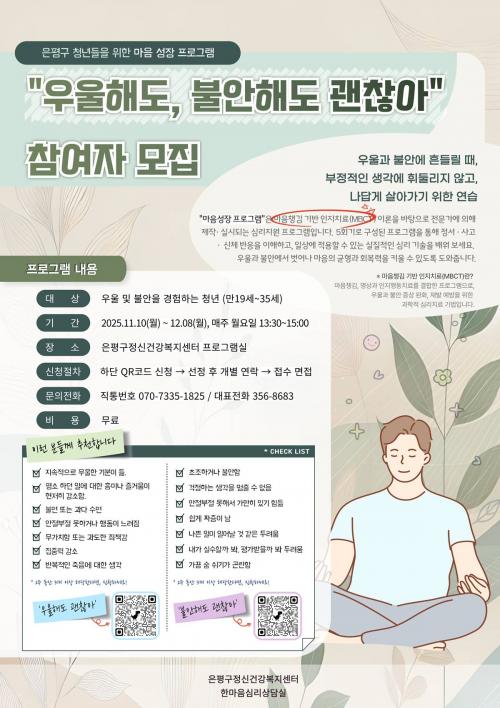 [½Åµ¿¾Æ¹æ¼Û ÀºÆò±¸=À̽ŵ¿±âÀÚ] ¼­¿ï ÀºÆò±¸´Â û³âµéÀÇ ¸¶À½ ¼ºÀå ÇÁ·Î±×·¥ÀÎ ¡®¿ì¿ïÇØµµ, ºÒ¾ÈÇØµµ ±¦Âú¾Æ¡¯ Âü¿©ÀÚ¸¦ ¸ðÁýÇÑ´Ù°í ¹àÇû´Ù. ±¸´Â ÀÓ»ó½ÇÇèÀ» ÅëÇØ È¿°ú¼ºÀÌ ÀÔÁõµÈ ¸¶À½ ì±èÀ» ±â¹ÝÇÑ ÀÎÁöÇൿġ·á(MBCT)¸¦ ÅëÇØ û³âµéÀÇ ¸¶À½À» µ¹º¸°íÀÚ ÇÑ´Ù. ÀÌ¡¦