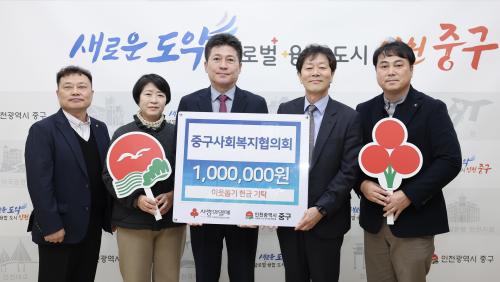 [½Åµ¿¾Æ¹æ¼Û ÀÎõ=À±¹Î½Ä±âÀÚ]ÀÎõ½Ã Áß±¸(±¸Ã»Àå ±èÁ¤Çå)´Â Áö³­ 3ÀÏ Áß±¸»çȸº¹ÁöÇùÀÇȸ(ȸÀå ¹ÚÁ¾½Ç)°¡ Áß±¸Ã»À» ¹æ¹®ÇØ °ü³» ¾î·Á¿î ÀÌ¿ôÀ» µ½±â À§ÇÑ ¡®ÀÌ¿ô»ç¶û ¼º±Ý¡¯ 100¸¸ ¿øÀ» ±âŹÇß´Ù°í ¹àÇû´Ù. À̹ø ÀÌ¿ô»ç¶û ¼º±ÝÀº ÀÎõ»çȸº¹Áö°øµ¿¸ð±Ýȸ¸¦ ÅëÇØ °ü¡¦