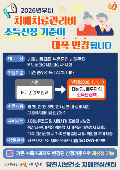 [½Åµ¿¾Æ¹æ¼Û=ÀÌÀçö±âÀÚ] ´çÁø½Ãº¸°Ç¼Ò Ä¡¸Å¾È½É¼¾ÅÍ´Â 2026³â 1¿ù 1ÀϺÎÅÍ Ä¡¸ÅÄ¡·á°ü¸®ºñ Áö¿ø»ç¾÷ÀÇ ¼Òµæ ±âÁØ »êÁ¤ ¹æ¹ýÀÌ º¯°æµÈ´Ù°í 31ÀÏ ¹àÇû´Ù. À̹ø Á¦µµ °³¼±À¸·Î Ä¡¸ÅÄ¡·á°ü¸®ºñ ¼Òµæ »êÁ¤ÀÌ °¡±¸ ´ÜÀ§ °Ç°­º¸Çè·á ±âÁØ¿¡¼­ ´ë»óÀÚ ¹× ¹è¿ìÀÚÀÇ ¼ÒµæÀç»ê ¡¦