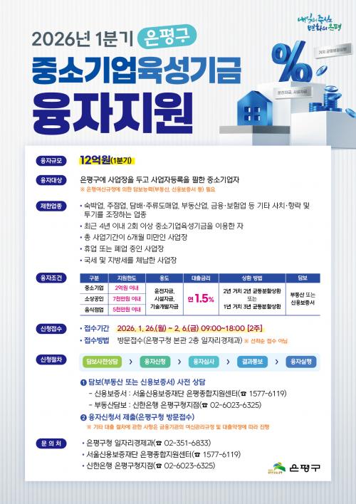 [½Åµ¿¾Æ¹æ¼Û ÀºÆò±¸=À̽ŵ¿±âÀÚ] ¼­¿ï ÀºÆò±¸´Â °ü³» Áß¼Ò±â¾÷°ú ¼Ò»ó°øÀÎÀÇ °æ¿µ ¾ÈÁ¤À» À§ÇØ ÃÑ 12¾ï ¿ø ±Ô¸ðÀÇ ¡®2026³â 1ºÐ±â Áß¼Ò±â¾÷ À°¼º±â±Ý À¶ÀÚÁö¿ø¡¯ »ç¾÷À» ½ÃÇàÇÑ´Ù°í ¹àÇû´Ù. Áö¿ø ´ë»óÀº ÀºÆò±¸¿¡ »ç¾÷ÀåÀ» µÎ°í »ç¾÷ÀÚµî·ÏÀ» ÇÑ Áß¼Ò±â¾÷°ú ¼Ò»ó°øÀΡ¦