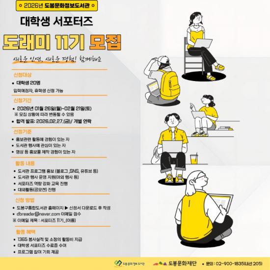 [½Åµ¿¾Æ¹æ¼Û µµºÀ±¸=À̽ŵ¿±âÀÚ] ¼­¿ï µµºÀ±¸ µµºÀ¹®È­Àç´Ü µµºÀ¹®È­Á¤º¸µµ¼­°üÀÌ ´ëÇлý ¼­Æ÷ÅÍÁî ¡®µµ·¡¹Ì 11±â¡¯¸¦ 2¿ù 21ÀϱîÁö ¸ðÁýÇÑ´Ù. ¡®µµ¼­°ü¿¡ ¿À´Â ¾Æ¸§´Ù¿î »ç¶÷µé¡¯À̶ó´Â Àǹ̸¦ °¡Áø µµ·¡¹Ì´Â 2015³âµµºÎÅÍ ¿î¿µµÅ ¿ÃÇØ·Î 11³â°¸¦ ¸Â¾Ò´Ù. µµ·¡¹Ì¡¦