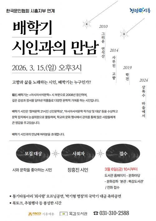 [½Åµ¿¾Æ¹æ¼Û ½ÃÈï½Ã=À̽ŵ¿±âÀÚ] ½ÃÈï½Ã¸ñ°¨µµ¼­°üÀº Áö¿ª¿¡¼­ Ȱµ¿ÇÏ´Â ÀÛ°¡µéÀ» ³Î¸® ¾Ë¸®°í, ½Ã¹ÎµéÀÌ ¹®ÇÐÀ» ´õ °¡±îÀÌ¿¡¼­ Áñ±æ ¼ö ÀÖµµ·Ï Çѱ¹¹®ÀÎÇùȸ ½ÃÈïÁöºÎ¿Í ¿¬°èÇÑ ¡®Áö¿ªÀÛ°¡¿ÍÀÇ ¸¸³²¡¯À» Áö³­ÇØ¿¡ ÀÌ¾î ¿ÃÇØµµ Áö¼Ó ¿î¿µÇÑ´Ù. ¿ÃÇØ ù ¸¸³²ÀÇ ÁÖÀΰø¡¦