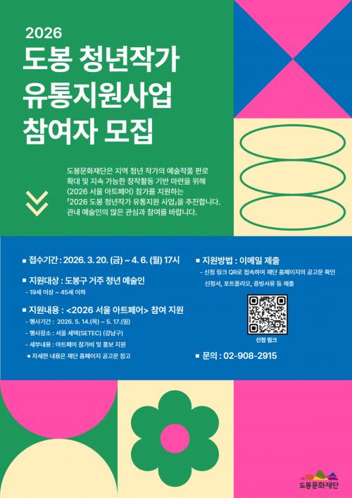[½Åµ¿¾Æ¹æ¼Û µµºÀ±¸=À̽ŵ¿±âÀÚ] ¼­¿ï µµºÀ±¸ µµºÀ¹®È­Àç´ÜÀÌ Áö¿ª û³â¿¹¼úÀÎÀÇ ¿¹¼úÀÛǰ ÆÇ·Î È®´ë¿Í Áö¼Ó °¡´ÉÇÑ Ã¢ÀÛȰµ¿ ±â¹Ý ¸¶·ÃÀ» À§ÇØ ¡®2026 µµºÀ û³âÀÛ°¡ À¯ÅëÁö¿ø »ç¾÷¡¯ Âü¿©ÀÛ°¡¸¦ ¸ðÁýÇÑ´Ù. ¸ðÁý ´ë»óÀº °ø°íÀÏ ±âÁØ µµºÀ±¸¿¡ °ÅÁÖÇÏ´Â 19¼¼ ÀÌ»ó 45¡¦