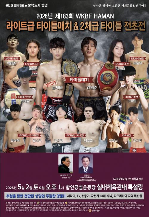 [½Åµ¿¾Æ¹æ¼ÛÇÔ¾È=À̽ŵ¿±âÀÚ]¿À´Â 2026³â ÇԾȱº¹ÎÀdz¯ 5¿ù2ÀÏ Åä¿äÀÏ ¿ÀÈÄ1½Ã, ÇÔ¾È °ø¼³¿îµ¿Àå ½Ç³»Ã¼À°°ü³» Ư¼³¸µ¿¡¼­ Á¦183ȸ WKBF HAMAN ¶óÀÌÆ®±Þ ŸÀÌÆ²¸ÅÄ¡ &2ü±Þ ŸÀÌÆ² ÀüÃÊÀü ½ÃÀÛÇÑ´Ù. - ´ëȸÀå : ±èÀα³ - »ç)¼¼°èÇÁ·Îűº¹½Ì¹«¿¡Å¸ÀÌÃÑ¿¬¸Í : ±èÁ¾¼· - ÁÖ ÃÖ : ÇԾȱº¹ÎÀdz¯ ÃßÁøÀ§¿øÈ¸ - ÁÖ °ü : »ç) ¼¼°èû¼Ò³âÀüÅëÈ£±¹¹«¿¹Àü±¹¿¬ÇÕ, »ç)¼¼°èÇÁ·Îűº¹½Ì¹«¿¡Å¸ÀÌÃÑ¿¬¸Í, »ç)´ëÇѹα¹È£±¹¼öÈ£´Ü - ÈÄ ¿ø : â¿øÀϺ¸,°æ³²½Å¹®, ÁÖ)°¡µð¾ð½º, ÁÖ)ÇÁ·ÎÅØ°¡µå,´ëÇÑ»ýȰüÀ°È¸, SDATV½Åµ¿¾Æ¹æ¼Û ÇÔ¾È - Çù Âù : ¿Á»êIMT, °¡¾ß³óÇù, »ïº¸»ê¾÷(ÁÖ), ÇÔ¾ÈÁö¹æ°ø»ç, ÇԾȻó°øÈ¸ÀǼÒ,NH³óÇùÀºÇà ÇÔ¾ÈÁöºÎ, ÇÔ¾ÈÃàÇù, ÁöƼÁö»ê¾÷(ÁÖ), BHI°Ç¼³(ÁÖ), È÷Æ®»ê¾÷, (ÁÖ)Á¶±¤ÁöÁú, ¼º½ÅRST(ÁÖ), ½Å¼º»ê¾÷°³¹ß, KN±â¾Æ¿ÀÅäÅ¥ ÇԾȼ­ºñ½º, ¡¦