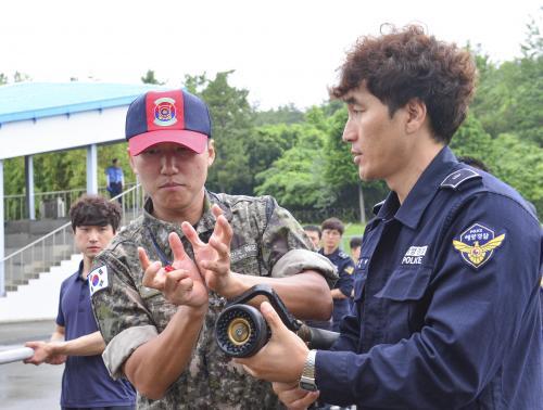ÀÌ¾î¼ ÈÆ·Ã¿¡ Âü°¡ÇÑ ÇØ°æµéÀº ¼Ò¹æº¹À» Á÷Á¢ÀÔ°í ½ÇÁ¦ ÈÀç°¡ ³ »óȲÀ» ÀçÇöÇÑ ¼ÒÈÈÆ·ÃÀåÀÇ È¿° ¼ÓÀ¸·Î ¶Ù¾îµé¾ú´Ù. ¾Õ »ç¶÷ÀÌ ÈÆ·ÃÀåÀÇ ¹®À» ¿ÀÚ ½ÃÄ¿¸Õ ¿¬±â¿Í ¶ß°Å¿î È¿°ÀÌ µ¤ÃĿԴÙ. ÇØ°æ ´ë¿øµéÀº È¿°°ú ¿±â¿¡ Á¤¸éÀ¸·Î ¸Â¼¸ç ±³°üÀÇ Áö½Ã¿¡ µû¶ó ÈÀ縦 Áø¾ÐÇß´Ù.