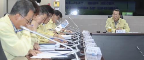 ÃÖ¿ë¹ü ÇàÁ¤ºÎÁö»ç´Â 18ÀÏ ¿ÀÈÄ 3½Ã Àç³»óȲ½Ç¿¡¼ Àç³¾ÈÀü´ëÃ¥º»ºÎ Çù¾÷ºÎ¼ ½Ç?±¹?¿øÀåÀ» ´ë»óÀ¸·Î ±ä±Þ´ëÃ¥ Á¡°ËȸÀǸ¦ ¿°í ÅÂdzÇÇÇØ°¡ ÃÖ¼ÒÈ µÇµµ·Ï ÀθíÇÇÇØ ¿ì·ÁÁö¿ª, ÀçÇØÀ§ÇèÁö¿ª ¾ÈÀü°ü¸®¿Í Æø¿ì ´ëºñ µÐÄ¡ÁÖÂ÷Àå, ÁöÇÏÂ÷µµ ´ëó¿¡ ¸¸ÀüÀ» ±âÇÒ °ÍÀ» Áö½ÃÇß´Ù.