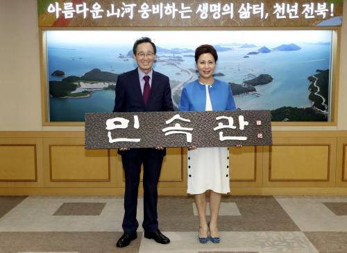 [½Åµ¿¾Æ¹æ¼Û=°¼º´ë ±âÀÚ] ¼ÛÇÏÁø ÀüºÏµµÁö»ç°¡ ÃÖ±Ù µµÃ» Á¢°ß½Ç¿¡¼ ±è¹Î¼± Àü ¹Ì±¹ ´º¿åÇÑÀÎȸÀå¿¡°Ô ÇÑÀÎÀ̹λç¹Ú¹°°ü¿¡ ºÎÂøÇÒ '¹Î¼Ó°ü' ÇöÆÇÀ» °Ç³Þ´Ù. ¼Û Áö»ç´Â Áö³ 7¿ù ´º¿åÇÑÀÎȸ¸¦ ¹æ¹®ÇßÀ» ´ç½Ã ÇöÆÇ ¿äûÀ» ¹ÞÀ½¿¡ µû¶ó º×±Û¾¾·Î Á÷Á¢ ¾´ ÇöÆÇÀ» Á¦ÀÛÇØ Àü´ÞÇß´Ù.