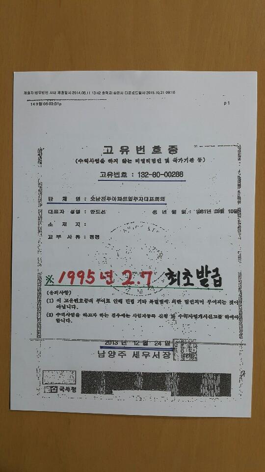 ÇØ´ç ¾ÆÆÄÆ®ÀÇ ¼±·®ÇÑ ´Ù¼ö Áֹε鿡 ÀÇÇϸé, ¡°´ç½Ã ÀÌ ¾ÆÆÄÆ®ÀÇ µ¿ ´ëÇ¥´Â Ⱦ·É»ç°ÇÀ¸·Î ±¸¼ÓµÇ°í 2013³â ´Ù¼ö Áֹε鿡 ÀÇÇØ ¡®¾Èµµ¼± ¾¾¡¯°¡ µ¿ ´ëÇ¥·Î ¼±ÃâµÆ´Ù. ±×´Â ÇØ´ç ¼¼¹«¼·ÎºÎÅÍ 1328000288ÀÇ °íÀ¯¹øÈ£¸¦ ¹ß±Þ ¹Þ¾ÒÀ¸¸ç °íÀ¯¹øÈ£Áõ¿¡ ´ëÇ¥·Î ±âÀçµÆ´Ù.