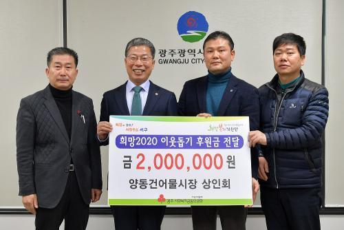 [½Åµ¿¾Æ¹æ¼Û=°¼º´ë ±âÀÚ] ±¤ÁÖ ¼±¸´Â 5ÀÏ ¿ÀÀü ±¸Ã»Àå½Ç¿¡¼ ¾çµ¿°Ç¾î¹°½ÃÀå »óÀÎȸ(ȸÀå À̸í±Ù)·ÎºÎÅÍ ÀÌ¿ô»ç¶ûÀ» ½ÇõÇÏ´Â ¿¬¸»¿¬½Ã ÀÌ¿ôµ½±â ¡®Èñ¸Á2020 ³ª´®Ä·ÆäÀΡ¯¿¡ ÈÄ¿ø±Ý(200¸¸¿ø)À» ±âŹ¹Þ°í ¾î·Á¿î ÀÌ¿ôÀ» À§ÇØ ÈÄ¿øÇØ Áֽŵ¥ ´ëÇØ °¨»çÀÇ ¸¶À½À» ÀüÇß´Ù.