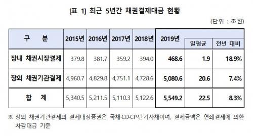À¯Çüº° ºÐ¼®À» º¸¸ç, Àå³» ä±Ç½ÃÀå°áÁ¦´ë±Ý ÃѾ×Àº 468.6Á¶¿ø(ÀÏÆò±Õ 1.9Á¶¿ø)À¸·Î Àü³â(394.0Á¶¿ø) ´ëºñ 18.9% Áõ°¡ÇÏ¿´À¸¸ç, ä±Ç°áÁ¦´ë±Ý ÃѾ×ÀÇ 8.4%¸¦ Â÷ÁöÇß´Ù.