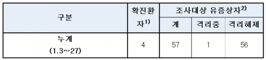 ÇöÀç±îÁö È®ÁøÀÚ¸¦ Á¦¿ÜÇÑ Á¶»ç´ë»ó À¯Áõ»óÀÚ´Â 57¸íÀÌ¸ç °Ë»çÁßÀÎ 1¸í ¿Ü 56¸íÀº °Ë»ç À½¼ºÀ¸·Î °Ý¸®ÇØÁ¦ µÇ¾ú´Ù.