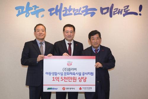 [½Åµ¿¾Æ¹æ¼Û=°¼º´ë ±âÀÚ] À̿뼷 ±¤ÁÖ±¤¿ª½ÃÀåÀÌ 29ÀÏ ¿ÀÀü ½Ãû 3Ãþ Á¢°ß½Ç¿¡¼ (ÁÖ)Ç÷¯¹ö ±âºÎ±Ýǰ Àü´Þ½Ä¿¡ Âü¼®ÇØ ¹ÚÁ¾¿À Ç÷¯¹ö ´ëÇ¥(¿ÞÂÊ), ÇÑ»ó¿ø ±¤ÁÖ»çȸº¹Áö°øµ¿¸ð±Ýȸ ȸÀå(¿À¸¥ÂÊ)·ÎºÎÅÍ ±âºÎ±ÝǰÀ» Àü´Þ ¹ÞÀº ÈÄ ±â³ä ÃÔ¿µÀ» Çϰí ÀÖ´Ù.