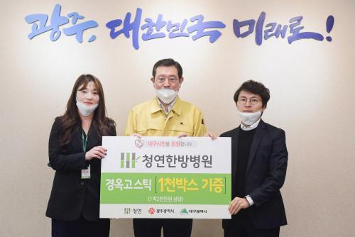 [½Åµ¿¾Æ¹æ¼Û=°­¼º´ë ±âÀÚ] À̿뼷 ±¤ÁÖ±¤¿ª½ÃÀåÀÌ 3ÀÏ ¿ÀÈÄ ½Ãû 3Ãþ Á¢°ß½Ç¿¡¼­ °í¿ëÁØ Ã»¿¬È¦µù½º ´ëÇ¥·ÎºÎÅÍ ´ë±¸½Ã¹Î Äڷγª19 ±Øº¹À» À§ÇØ ¸é¿ª·Â Áõ°­¿¡ Ź¿ùÇÑ È¿´ÉÀÌ ÀÖ´Â °æ¿Á°í 1000¼¼Æ®¸¦ Àü´Þ ¹ÞÀº µÚ ±â³äÃÔ¿µÀ» Çϰí ÀÖ´Ù.