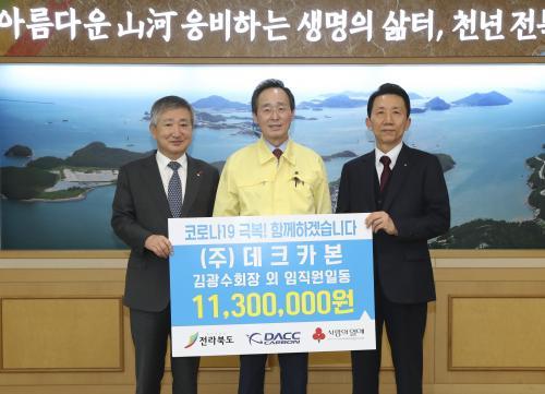 [½Åµ¿¾Æ¹æ¼Û=°¼º´ë ±âÀÚ] 17ÀÏ ÀüºÏµµÃ» Á¢°ß½Ç¿¡¼ ¿¸° (ÁÖ)µ¥Å©Ä«º» Äڷγª19 ±Øº¹ ¼º±Ý Àü´Þ½Ä¿¡ ¼ÛÇÏÁø ÀüºÏµµÁö»ç¿Í ±è±¤¼ö µ¥Å©Ä«º» ´ëÇ¥ÀÌ»ç, ±èµ¿¼ö »çȸº¹Áö°øµ¿¸ð±ÝȸÀå ¹× Âü¼®ÀÚµéÀÌ ¼º±Ý Àü´Þ½ÄÀ» °®°í ÀÖ´Ù.
