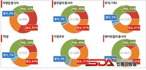 Äڷγª19·Î ÀÎÇØ ¡®°¡Á¤ »ì¸²»ìÀÌ¿¡ ¿µÇâÀ» ¹Þ¾Ò´Ù¡¯´Â ÀÀ´äÀÌ 70%¿¡ ´ÞÇßÀ¸¸ç, ¡®¼ÒµæÀÌ ÁÙ¾ú´Ù¡¯´Â ÀÀ´äµµ 61%·Î ³ô¾Ò´Ù. Á÷¾÷º°·Î´Â ºí·çÄ®¶ó(67%), È­ÀÌÆ®Ä®¶ó(55%)·Î ³ªÅ¸³µ°í, ƯÈ÷ ÀÚ¿µ¾÷ÀÚ °èÃþ¿¡¼­´Â 85%°¡ ¼ÒµæÀÌ ÁÙ¾ú´Ù°í ÀÀ´äÇß´Ù.