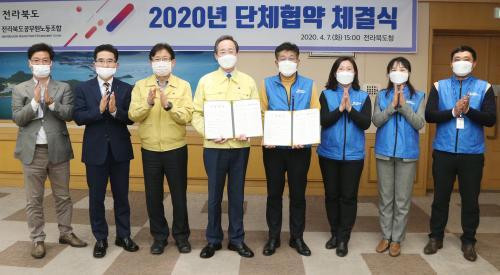 [½Åµ¿¾Æ¹æ¼Û=°¼º´ë ±âÀÚ] 7ÀÏ ÀüºÏµµÃ» Á¢°ß½Ç¿¡¼ ¿¸° 2020³â ÀüºÏµµ-Àü¶óºÏµµ °ø¹«¿ø³ëµ¿Á¶ÇÕ ´ÜüÇù¾à ü°á½Ä¿¡ ¼ÛÇÏÁø ÀüºÏµµÁö»ç¿Í ±èÇü±¹ ÀüºÏµµ °ø¹«¿ø³ëµ¿Á¶ÇÕÀ§¿øÀåÀ» ºñ·ÔÇÑ Âü¼®ÀÚµéÀÌ Ã¼°á½ÄÀ» °¡Áø ÈÄ ±â³äÃÔ¿µÀ» Çϰí ÀÖ´Ù.