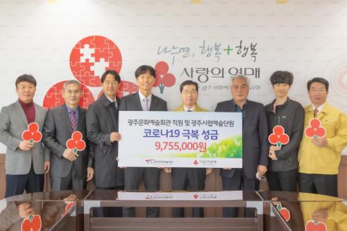 ±¤ÁÖ¹®È­¿¹¼úȸ°ü(°üÀå ¼ºÇöÃâ)Àº Äڷγª19 ±Øº¹À» À§ÇÑ ¼º±Ý 9¹é7½Ê5¸¸5õ¿øÀ» ±¤ÁÖ»çȸº¹Áö°øµ¿¸ð±Ýȸ(ȸÀå ÇÑ»ó¿ø)¿¡ Àü´ÞÇß´Ù.
