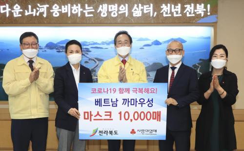 [½Åµ¿¾Æ¹æ¼Û=°­¼º´ë ±âÀÚ] Àü¶óºÏµµ¿Í ¿ìÈ£°ü°è¸¦ ¸ÎÀº º£Æ®³² ±î¸¶¿ì¼ºÀÌ ¡®Äڷγª19¡¯ ¿¹¹æÀ» À§ÇØ 1õ¸¸¿ø »ó´çÀÇ ÀÇ·á¿ë ¸¶½ºÅ© 1¸¸ÀåÀ» ÀüºÏ¿¡ º¸³»¿Â °¡¿îµ¥ 27ÀÏ ÀüºÏµµÃ» Á¢°ß½Ç¿¡¼­ ¼ÛÇÏÁø ÀüºÏµµÁö»ç, À̺´°ü Àü¶óºÏµµº´¿øÈ¸Àå, ¼­¿µ¼÷ »çȸº¹Áö°øµ¿¸ð±Ýȸ »ç¹«Ã³Àå µî Âü¼®ÀÚµéÀÌ º£Æ®³² ±î¸¶¿ì¼ºÀÌ º¸³»¿Â ÀÇ·á¿ë µ§Å» ¸¶½ºÅ© 1¸¸ÀåÀ» Àü¶óºÏµµº´¿øÈ¸¿¡ Àü´ÞÇϰí ÀÖ´Ù.