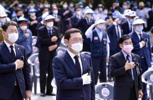 [½Åµ¿¾Æ¹æ¼Û=°¼º´ë ±âÀÚ] À̿뼷 ±¤ÁÖ±¤¿ª½ÃÀåÀÌ 6ÀÏ ¿ÀÀü ³²±¸ ±¤ÁÖ°ø¿ø ÇöÃæÅ¾¿¡¼ ¿¸° 'Á¦65ȸ ÇöÃæÀÏ Ãß³ä½Ä'¿¡ Âü¼®ÇØ ±¹¹ÎÀǷʸ¦ Çϰí ÀÖ´Ù.