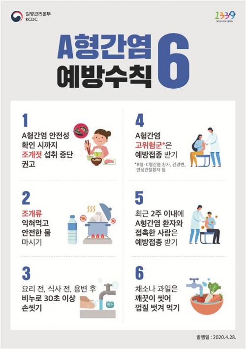 ÀÌ¿¡ ±¤Áֽô AÇü °£¿° ¿¹¹æÀ» À§ÇØ ¾ÈÁ¤¼º È®ÀÎ ½Ã±îÁö Á¶°³Á£ ¼·Ãë Áß´Ü ±Ç°í, Á¶°³·ù ÀÍÇô¸Ô±â, ¿ä¸® Àü¡¤½Ä»ç Àü¡¤ÈÀå½Ç ´Ù³à¿Â ÈÄ ºñ´©·Î 30ÃÊ ÀÌ»ó ¼Õ¾Ä±â, ¾ÈÀüÇÑ ¹° ¸¶½Ã±â, ä¼Ò³ª °úÀÏÀº ±ú²ýÀÌ ¾Ä¾î ²®Áú ¹þ°Ü ¸Ô±â µîÀÇ ¿¹¹æ¼öÄ¢ Áؼö¸¦ ´çºÎÇß´Ù.