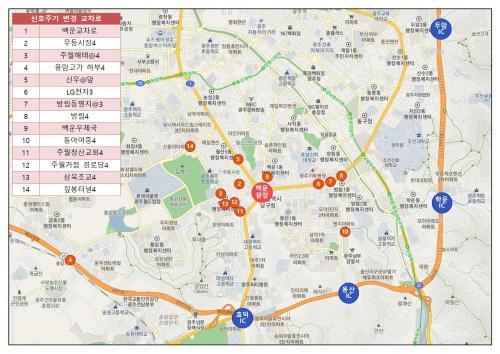 Á¦2¼øÈ¯µµ·Î È¿´öIC(Á¦2¼øÈ¯·Î¡æ¼¹®´ë·Î ¹æ¸é), ¿ë»êIC(¿ë»êIC¡æ¿ë´ë·Î ¹æ¸é), µÎ¾ÏIC(Á¦2¼øÈ¯·Î¡æ°¥¸¶·Î ¹æ¸é), ÇпîIC(Á¦2¼øÈ¯·Î¡æÀÇÀç·Î ¹æ¸é) µî 4°³¼Ò ÁøÃâÀÔ·ÎÀÇ ½ÅÈ£½Ã°£À» ¿¬ÀåÇÒ °ÍÀ̸ç, ¹é¿î±³Â÷·Î ¹× ȸÀç·Î, ´ë³²´ë·Î µî 14°³ ±³Â÷·ÎÀÇ ½ÅÈ£Áֱ⠺¯°æ°ú ÇÔ²² ÁÖº¯ ±³Â÷·Î¿Í ¿¬µ¿Ã¼°è¸¦ À籸ÃàÇØ ÇѹøÀÇ ½ÅÈ£ Áֱ⿡ ¸¹Àº ±³Åë·®À» ó¸®ÇÒ °èȹÀÌ´Ù.