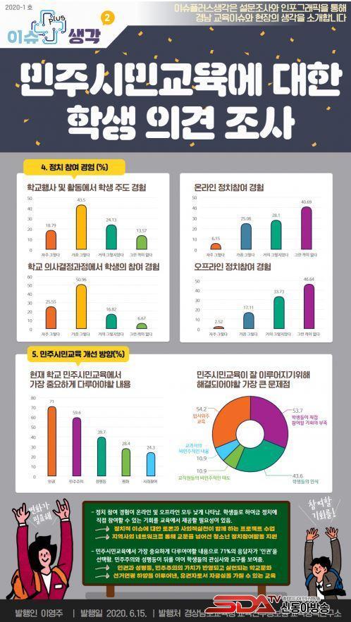 Çб³ ¹ÎÁֽùα³À°ÀÌ º¸´Ù Àß ÀÌ·ç¾îÁö±â À§ÇØ ÇØ°áµÇ¾î¾ß ÇÒ °¡Àå Å« ¹®Á¦Á¡ÀÌ ¹«¾ùÀ̳Ĵ Áú¹®¿¡ 54.2%ÀÇ ÇлýµéÀÌ ¡®Á÷Á¢ Âü¿©ÇÒ ±âȸÀÇ ºÎÁ·¡¯À» ¼±ÅÃÇß´Ù. ÀÌ´Â ¡®ÀÔ½ÃÀ§ÁÖ ±³À°(53.7%)¡¯º¸´Ù ³ôÀº ¼öÄ¡·Î °æ³²Áö¿ª °íµîÇлýµéÀÌ ±Ç¸®ÁÖü·Î¼ Á÷Á¢ Á¤Ä¡¿¡ Âü¿©ÇÏ°í ½ÇõÇϰíÀÚ ÇÏ´Â ¿å±¸°¡ ³ô´Ù´Â °ÍÀ» ¾Ë ¼ö ÀÖ´Â °á°ú´Ù.
