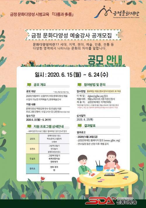 ¡®´Ù¸§°ú Òý¸§¡¯ÀÇ ¿î¿µÀ» À§ÇØ ±ÝÁ¤¹®ÈÀç´ÜÀº 4°³ ÃʵîÇб³ÀÇ µ¿¾Æ¸®¹Ý¿¡¼ ¹®È´Ù¾ç¼º ¿¹¼ú±³À°À» ´ã´çÇÒ ¿¹¼ú°»ç¸¦ ¿À´Â 24ÀϱîÁö ¸ðÁýÇÑ´Ù.