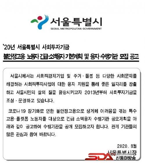 À̸¦ À§ÇØ ¼­¿ï½Ã´Â ¿À´Â 24ÀÏ(¿ù)±îÁö¡¸ºÒ¾ÈÁ¤°í¿ë ³ëµ¿ÀÚ ±ä±Þ ¼Ò¾×À¶ÀÚ ¼öÇà±â°ü¡¹À» ¸ðÁýÇÑ´Ù°í ¹àÇû´Ù. ¼öÇà±â°ü ¸ðÁý °ü·Ã ÀÚ¼¼ÇÑ »çÇ×Àº ¼­¿ï½Ã ȨÆäÀÌÁö¿¡¼­ È®ÀÎÇÒ ¼ö ÀÖ´Ù.